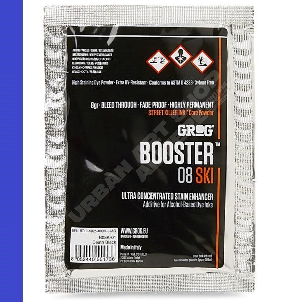 Meng één zakje Grog Booster 08 SKI Diving Blue met maximaal 800 ml inkt (vier flessen van 200 ml). Laat het mengsel een nacht rusten voor maximale werking en optimale pigmentdiepte.
