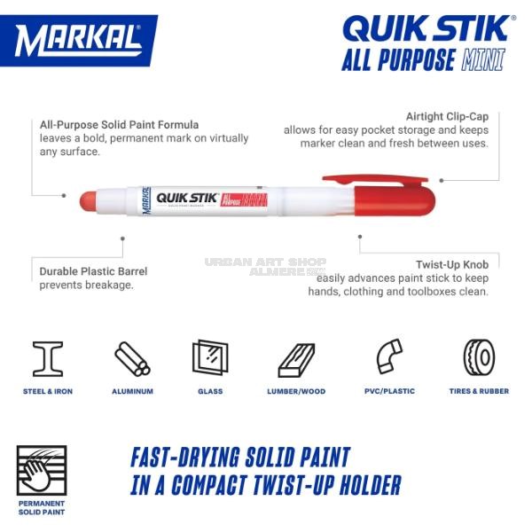 Of je nu objecten personaliseert, technische markeringen zet of creatief werkt op ongebruikelijke ondergronden: de Markal Quik Stik Mini White biedt sterke dekking en langdurige zichtbaarheid. Geschikt voor urban artists, makers en vakmensen die resultaat eisen.